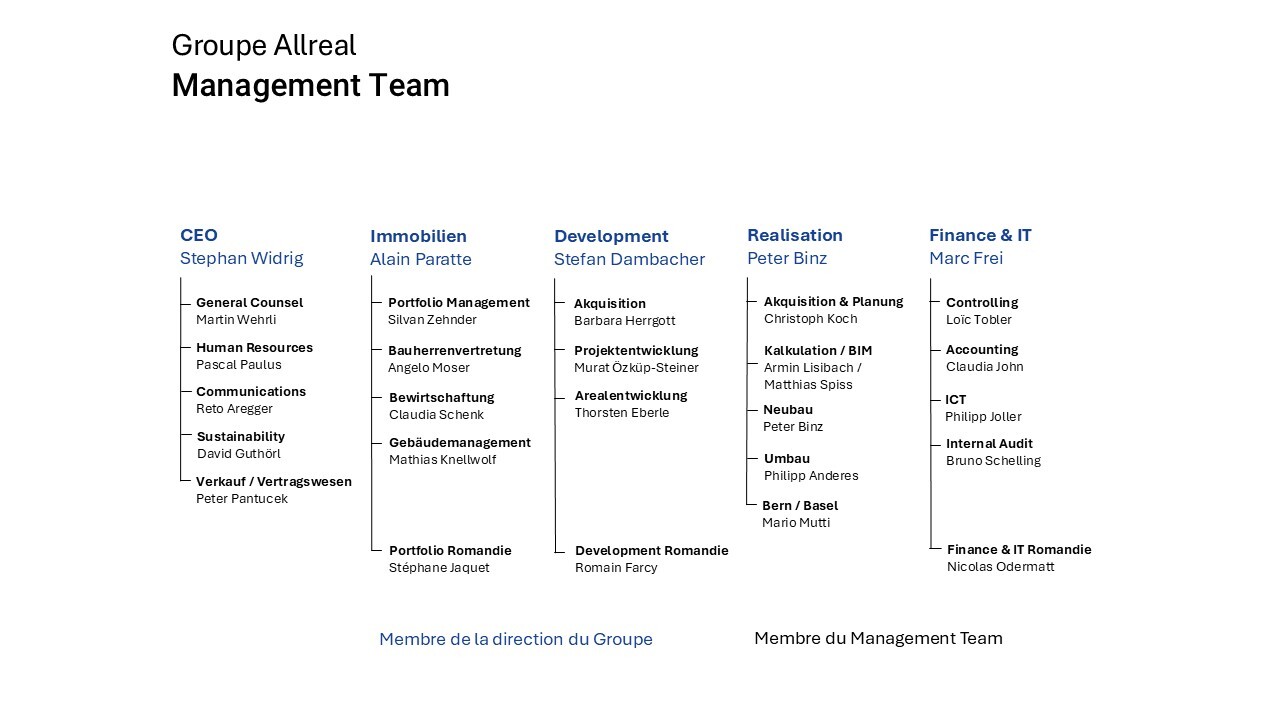 Le conseil d'administration, composé de huit personnalités indépendantes, est responsable de l'orientation stratégique et du développement à long terme d'Allreal. Il supervise également la mise en œuvre opérationnelle de cette stratégie et agit en tant qu'instance de contrôle vis-à-vis de la direction du groupe.