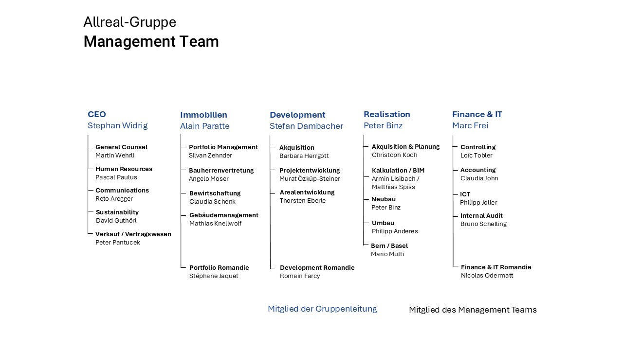 Der Verwaltungsrat, bestehend aus acht unabhängigen Persönlichkeiten und trägt die Verantwortung zur strategischen Ausrichtung sowie zur langfristigen Entwicklung von Allreal bei. Zugleich überwacht der Verwaltungsrat die operative Umsetzung dieser Strategie und agiert als Kontrollinstanz gegenüber der Gruppenleitung.